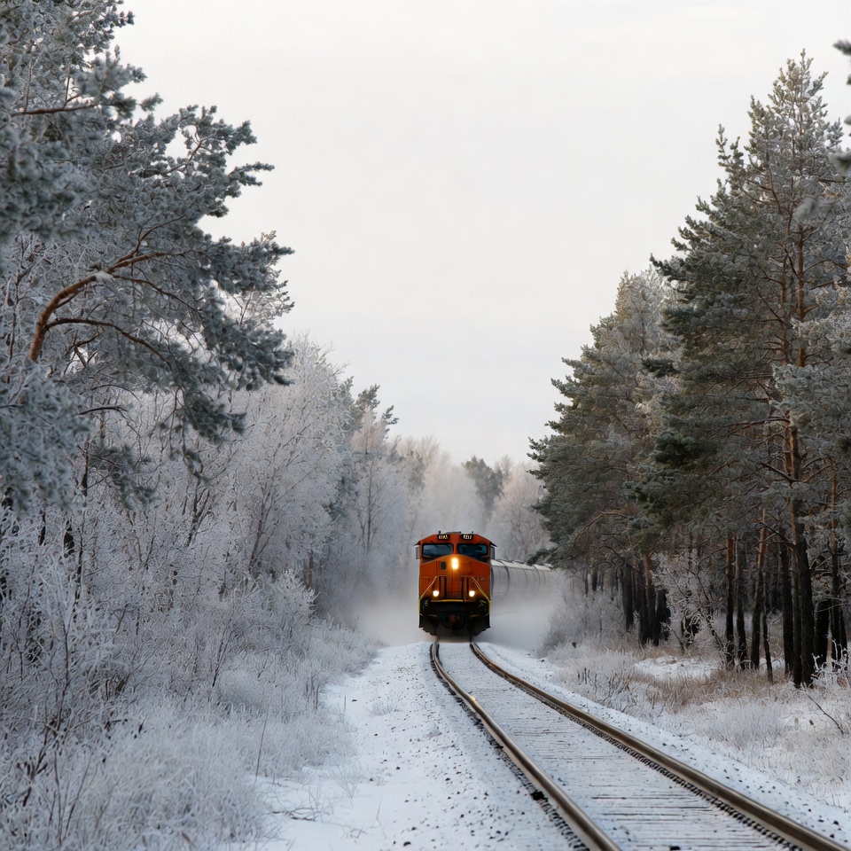 An orange freight train travels along snowy tracks through a dense forest of pine trees covered in frost and snow. Snow dust trails behind the locomotive as it moves forward on a narrow path lined with white trees. The sky is overcast, enhancing the winter scene.