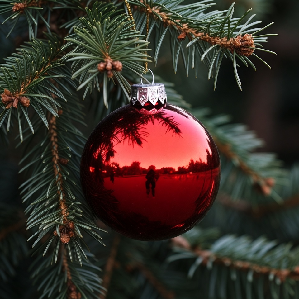 A shiny red Christmas ornament hangs from a green fir tree branch. The reflective surface of the bauble captures blurred reflections of surrounding tree branches. Silver cap and hook secure it in place against a dark background.