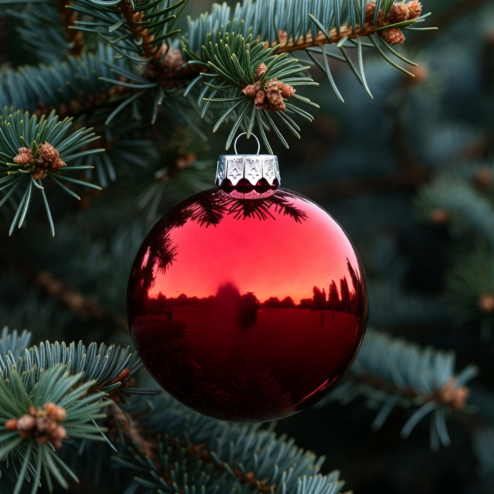 A shiny red Christmas bauble with a silver top hangs from a green fir tree branch. The reflective surface of the ornament captures blurred reflections of surrounding branches and possibly distant buildings. Needles and small cones are visible on the evergreen bough.