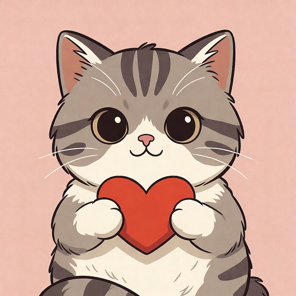 A chibi-style gray tabby kitten with large sparkling eyes holds a bright red heart in its paws. The cat has white markings on its muzzle and chest, and sits against a soft pink background. The illustration features clean lines and a kawaii aesthetic.