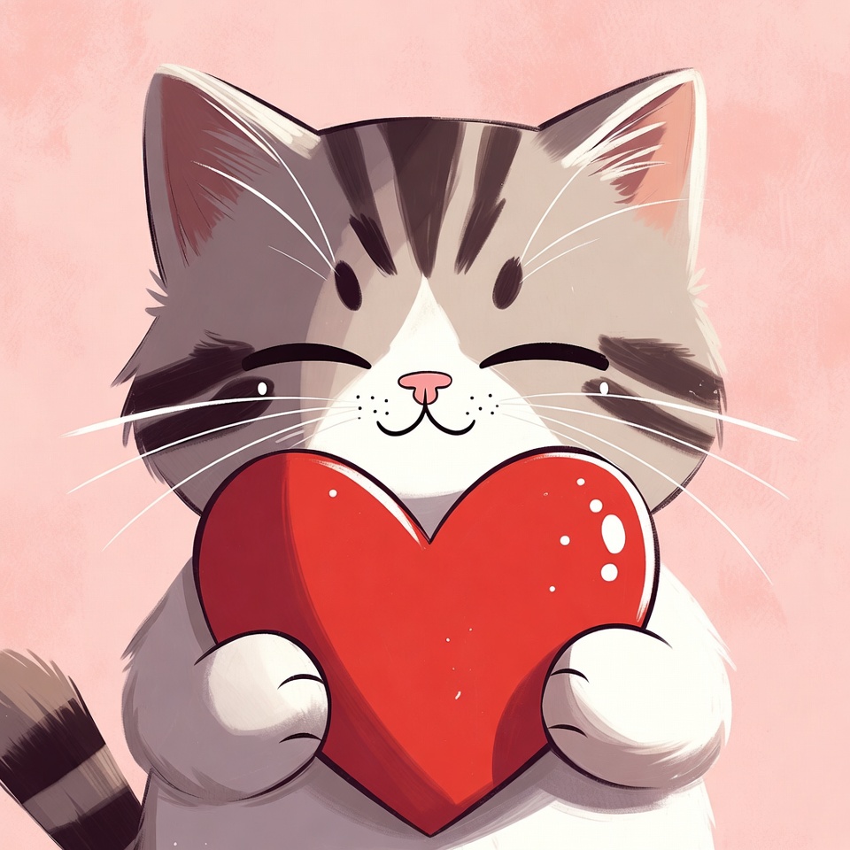animal illustration, anime style, cartoon cat, chibi cat, clipart, cute cat, happy cat, heart shape, holding heart, illustration, kawaii, love heart, paws, pink background, red heart, smiling cat, tabby cat, valentine cat, cat