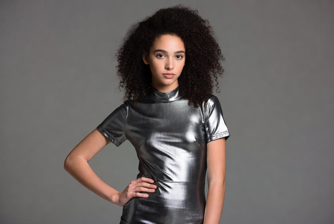 A young woman with curly afro hair stands confidently against a gray background. She wears a shiny metallic silver short-sleeved dress with a high neckline. Her hands are positioned on her hips in a poised pose.