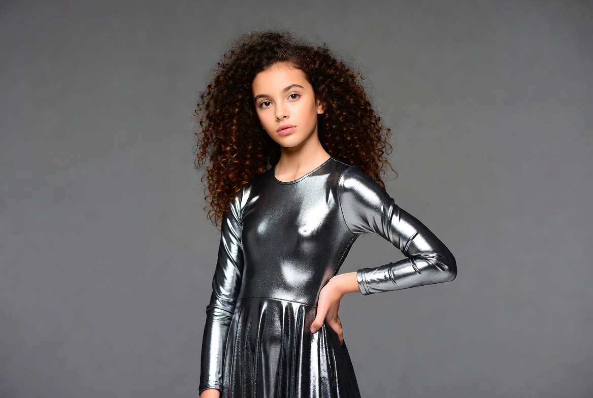 A young girl with curly dark hair stands posing on a gray background. She wears a long-sleeved shiny silver dress with a flared skirt and hand on hip. Her expression is confident with a slight smile.