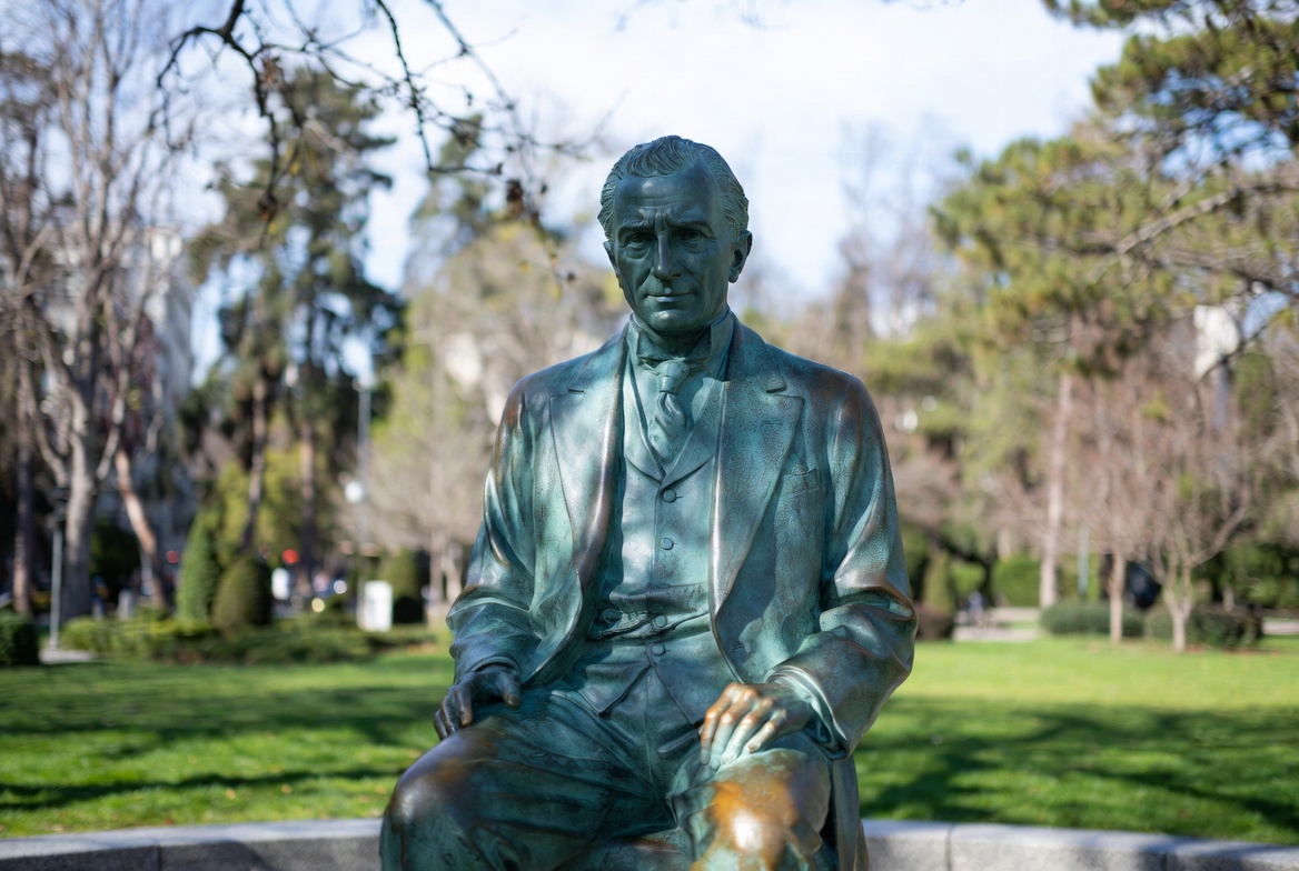 Serbian, White, bare trees, bronze statue, grass, green grass, historical figure, inventor, male, monument, outdoor, park, sculpture, sitting man, statue, stone base, suit, trees, vest, Nikola Tesla