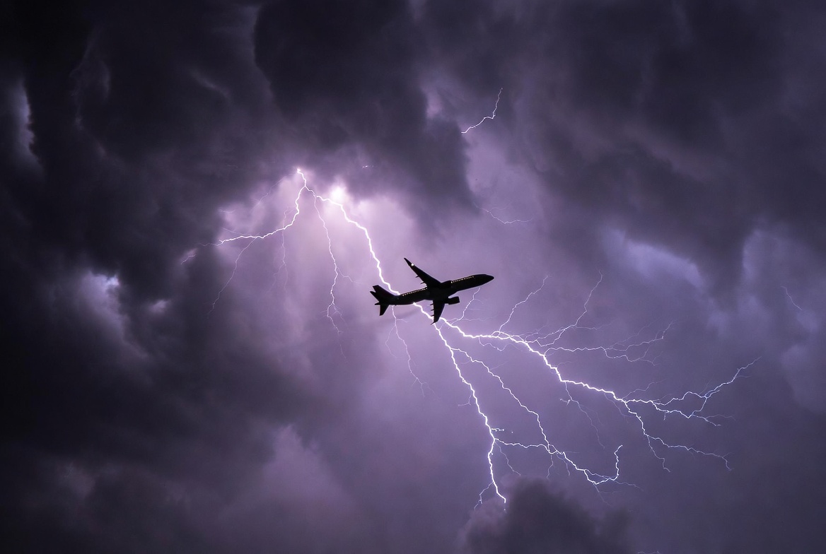 aircraft, aviation, clouds, dark sky, dramatic, flight, flying, jet, lightning, lightning bolts, plane, purple clouds, silhouette, sky, storm, stormy sky, thunderclouds, thunderstorm, weather, airplane