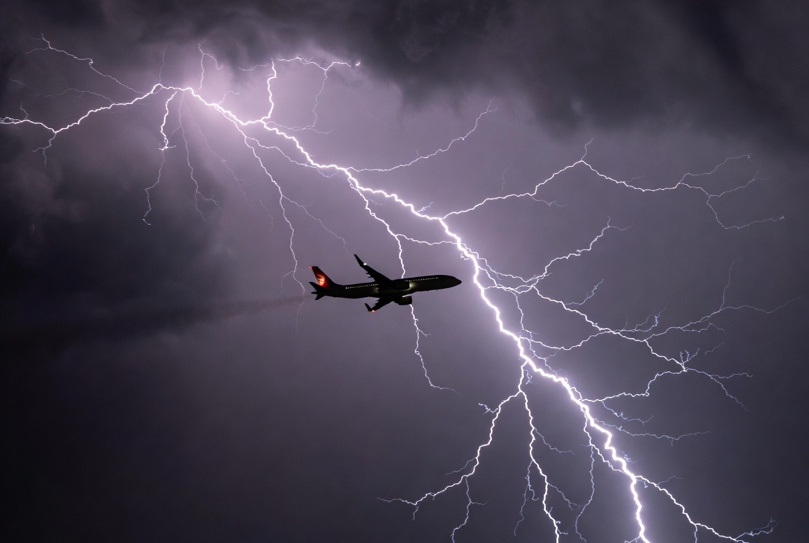 aircraft, aviation, bolt, clouds, commercial jet, dark clouds, dramatic, electricity, flying, jet, lightning, night sky, plane, powerful storm, red tail, silhouette, sky, storm, thunder, thunderstorm, turbulent, weather, airplane