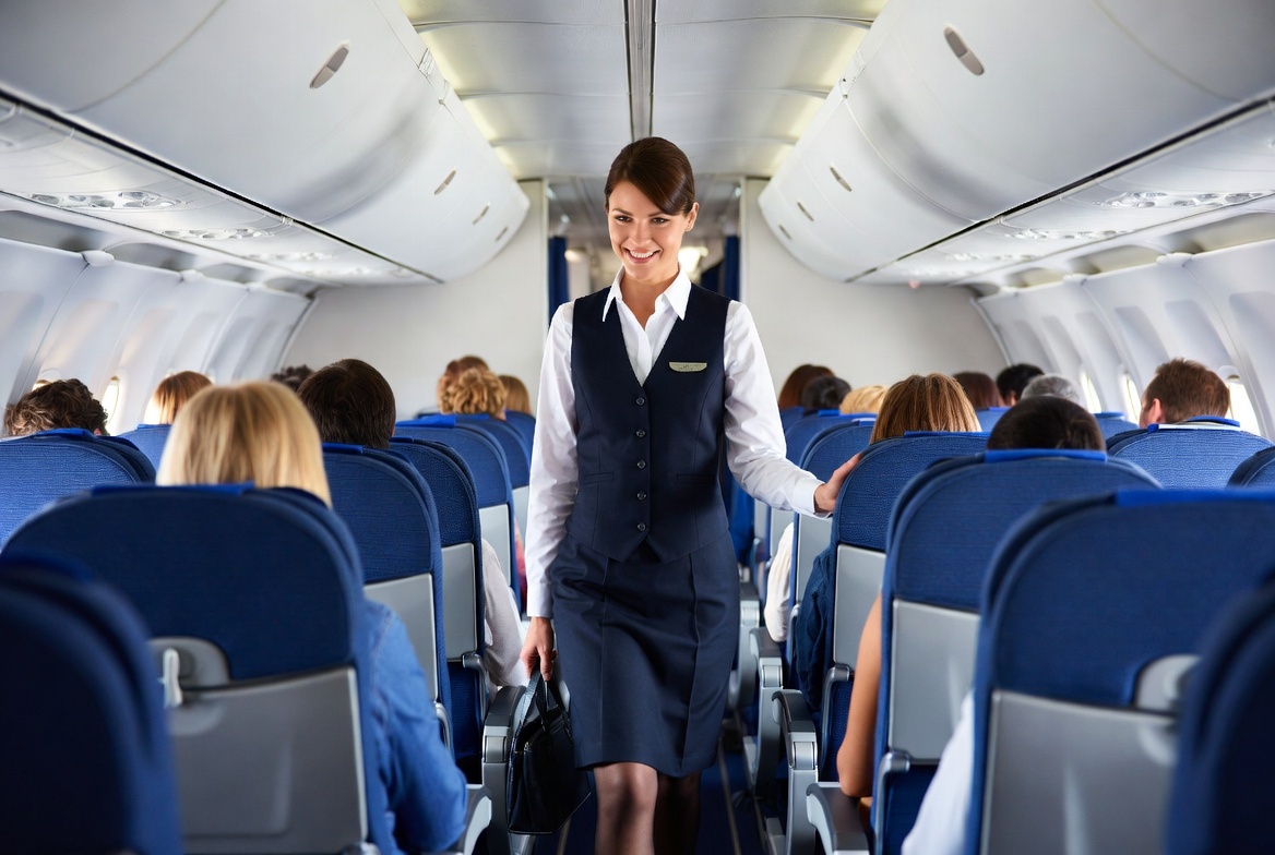 A smiling female flight attendant in a navy blue uniform and white blouse walks down the aisle of a commercial airplane. She carries a briefcase in one hand and gestures with the other amid rows of blue seats. Passengers of diverse ethnicities sit on both sides, facing forward in the cabin.