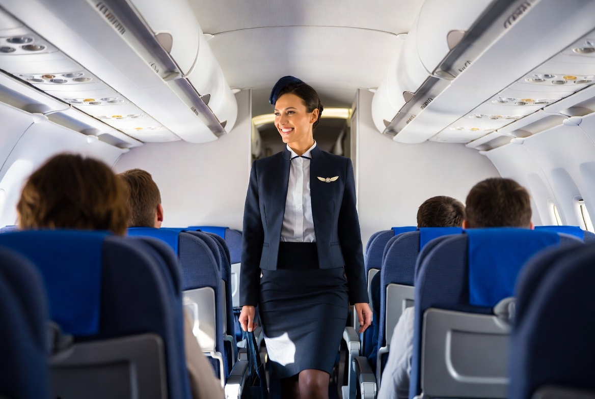 A smiling female flight attendant in a navy blue uniform and skirt walks down the aisle of an airplane cabin. Blue passenger seats line both sides, with several passengers seated facing forward. Overhead bins and lighting fixtures are visible above.
