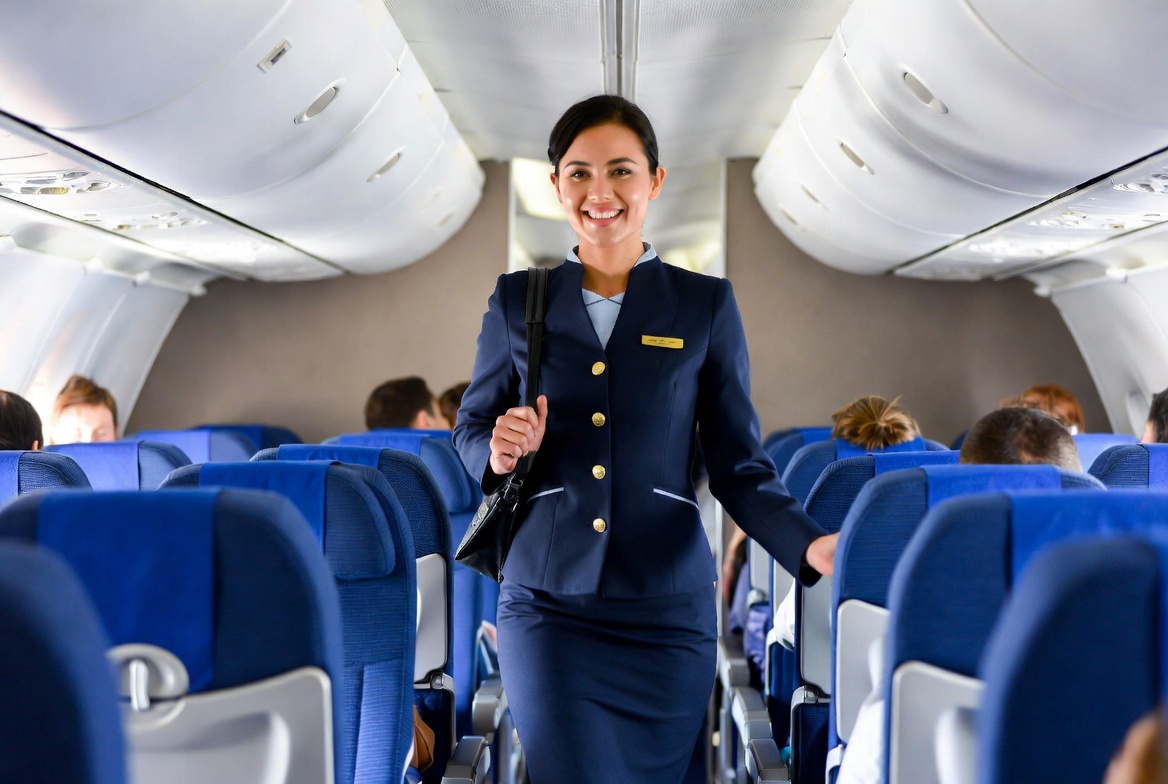 A smiling Asian woman in a navy blue flight attendant uniform walks down the aisle of an airplane. She holds a black bag in one hand and gestures with the other amid rows of blue seats and blurred passengers. The cabin overhead panels and seating are visible in the background.