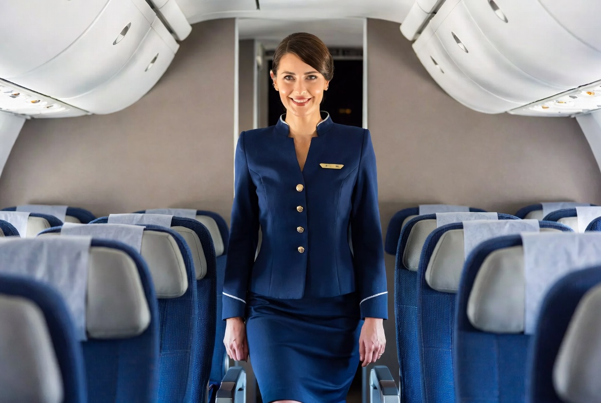 A smiling woman in a navy blue flight attendant uniform stands in the aisle of an airplane cabin. She holds a handle and wears a skirt suit with a name badge. Rows of blue passenger seats and overhead bins line the background.
