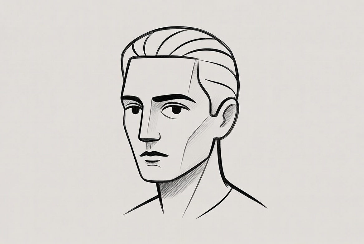 adult man, artistic, black lines, combed hair, drawing, face, graphic art, headshot, human face, illustration, ink sketch, line drawing, male, minimalist, portrait, profile, side view, sketch, stylized portrait, vector style, white background, man