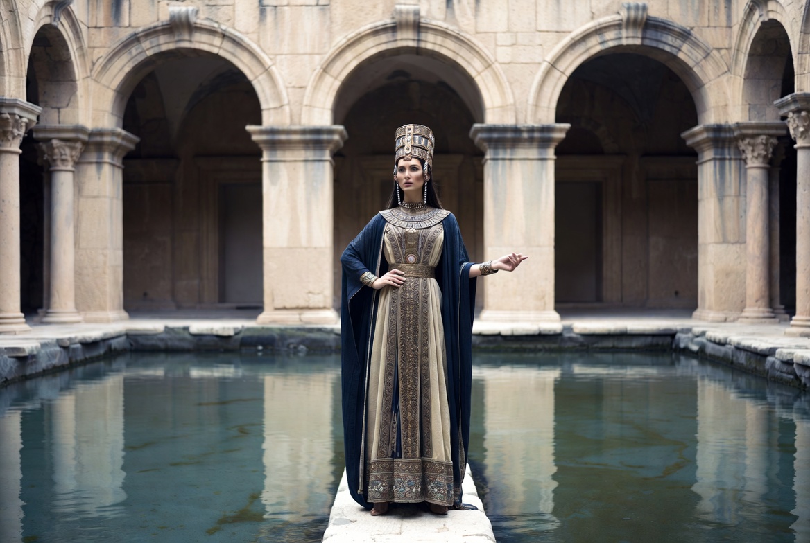 Cleopatra, Middle Eastern, ancient Egypt, ancient architecture, arches, blue dress, columns, cultural attire, elaborate dress, embroidered gown, gold gown, historical costume, isolated background, ornate jewelry, pharaoh, reflecting pool, regal pose, stone courtyard, stone platform, tall headdress, woman, Egyptian queen