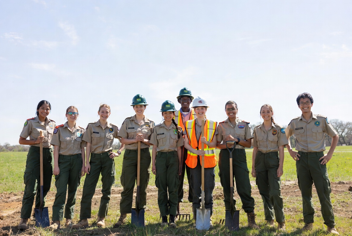 African-American, Asian, Latino, White, blue sky, diverse, female, grassy field, green hats, group, male, orange vest, outdoors, people, rake, rangers, safety gear, shovels, tan pants, tan shirts, team, uniforms, park rangers
