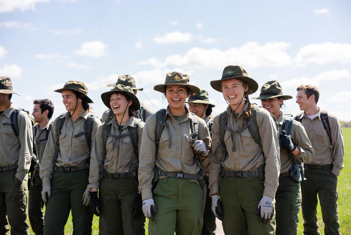 A diverse group of park rangers in green uniforms, hats, backpacks, and gloves stands together on grassy terrain under a partly cloudy sky. They smile and pose for the camera, with some holding gear. The team includes both men and women facing forward.