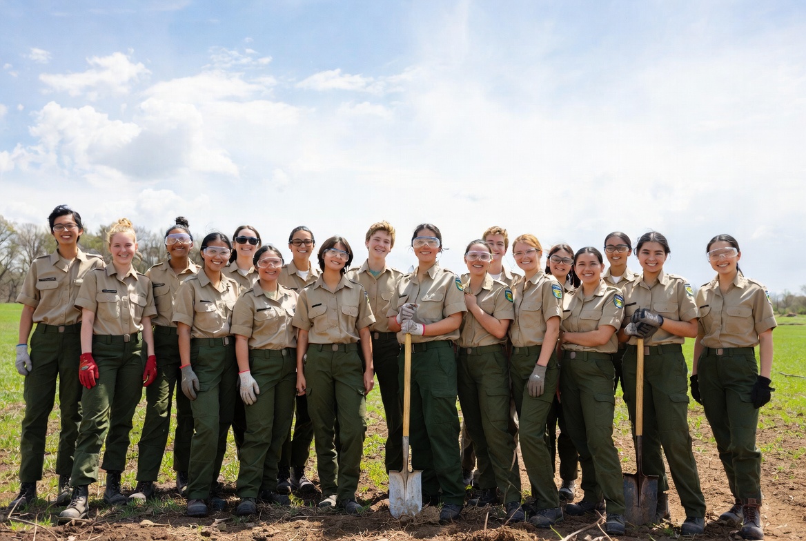 African-American, Asian, Latino, White, cloudy sky, digging, diverse, female, girls, gloves, grass field, green pants, group, khaki shirts, multiracial, outdoors, planting activity, safety glasses, shovels, team, uniforms, women, young women, Girl Scouts
