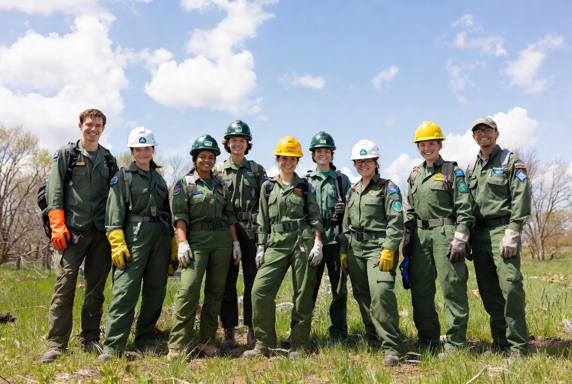 A diverse group of nine forest service workers stands together on grassy terrain under a blue sky with clouds. They wear matching green uniforms, hard hats in white, green, and yellow, work gloves, and orange armbands. Several carry backpacks and wear badges on their outfits.