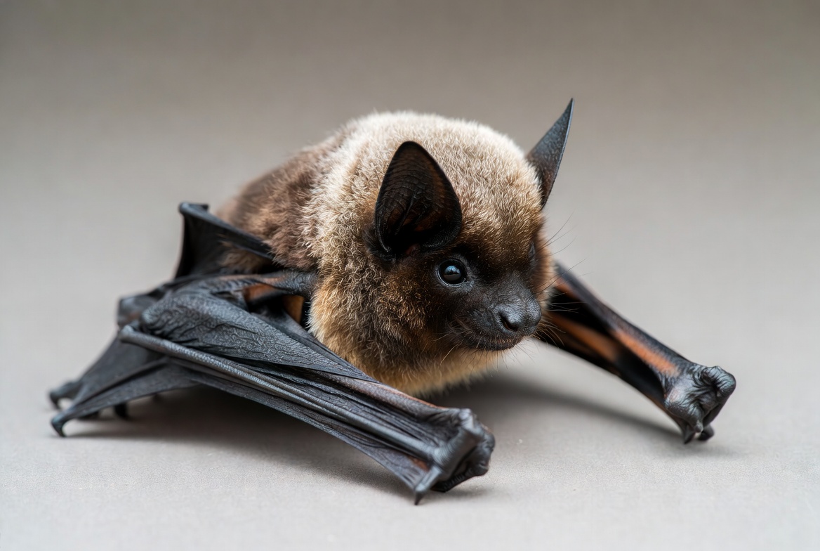 A brown bat with large wings spread out lies on a light gray surface. Its fur is a mix of brown and light gray, with prominent pointed ears and a small snout. The bat faces forward with wings extended, isolated on a plain background.