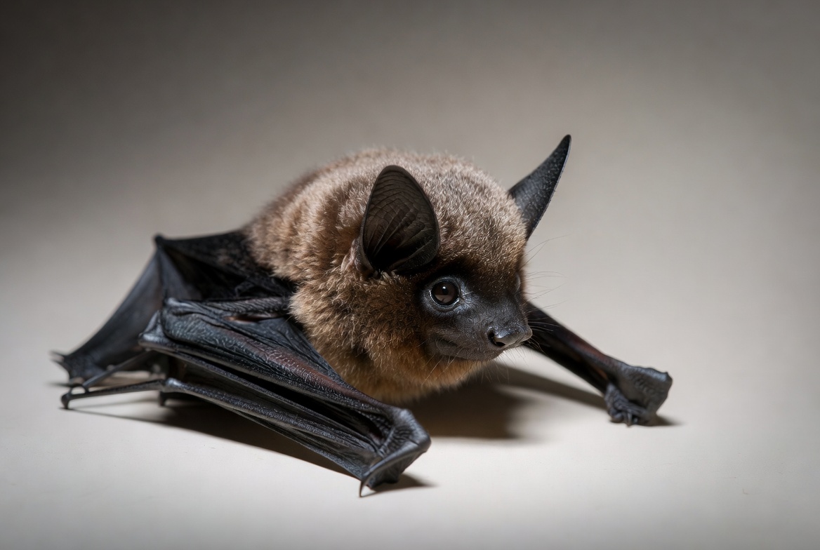 A brown bat lies on a light gray background with its wings partially spread open. It has large pointed ears, dark eyes, and a furry body. The bat faces forward with its legs extended.