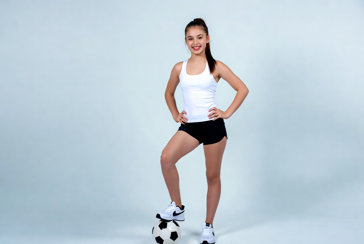 Asian, athletic girl, black shorts, confident pose, female, football ball, hands on hips, isolated background, ponytail, soccer ball, soccer player, sports girl, sportswear, standing on ball, white sneakers, white tank top, young girl, youth sports, girl