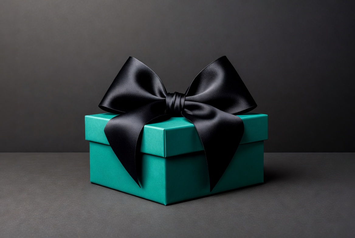A teal gift box sits on a dark gray surface, topped with a large black satin bow. The bow's shiny fabric drapes elegantly over the box's edges. The image features a clean, isolated background.