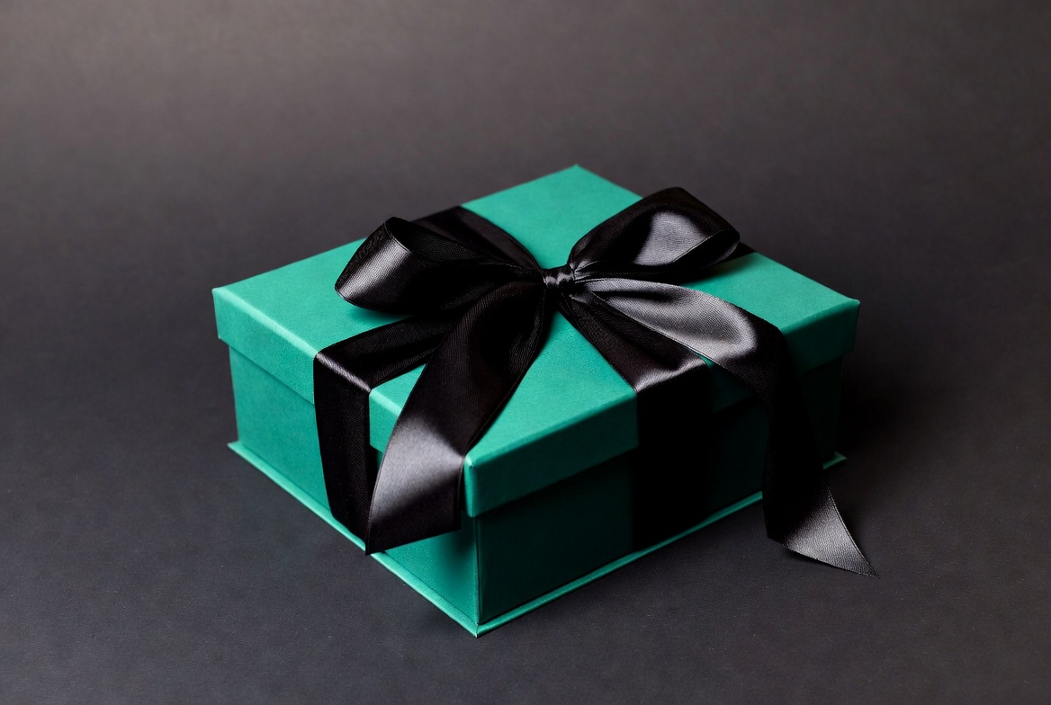 Teal gift box with black ribbon