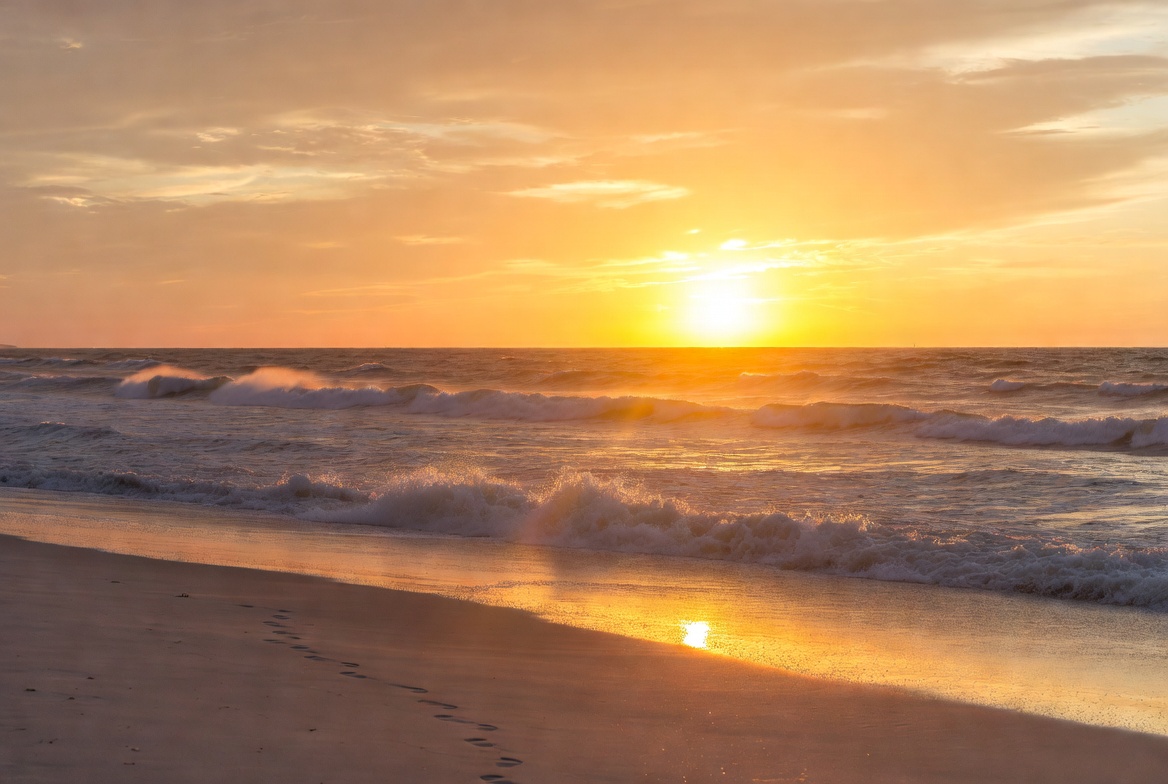 A vibrant sunset illuminates the ocean with golden hues and scattered clouds. Waves crash onto a sandy beach featuring a trail of footprints leading toward the water. The sun hovers low above the horizon, reflecting on the wet sand.