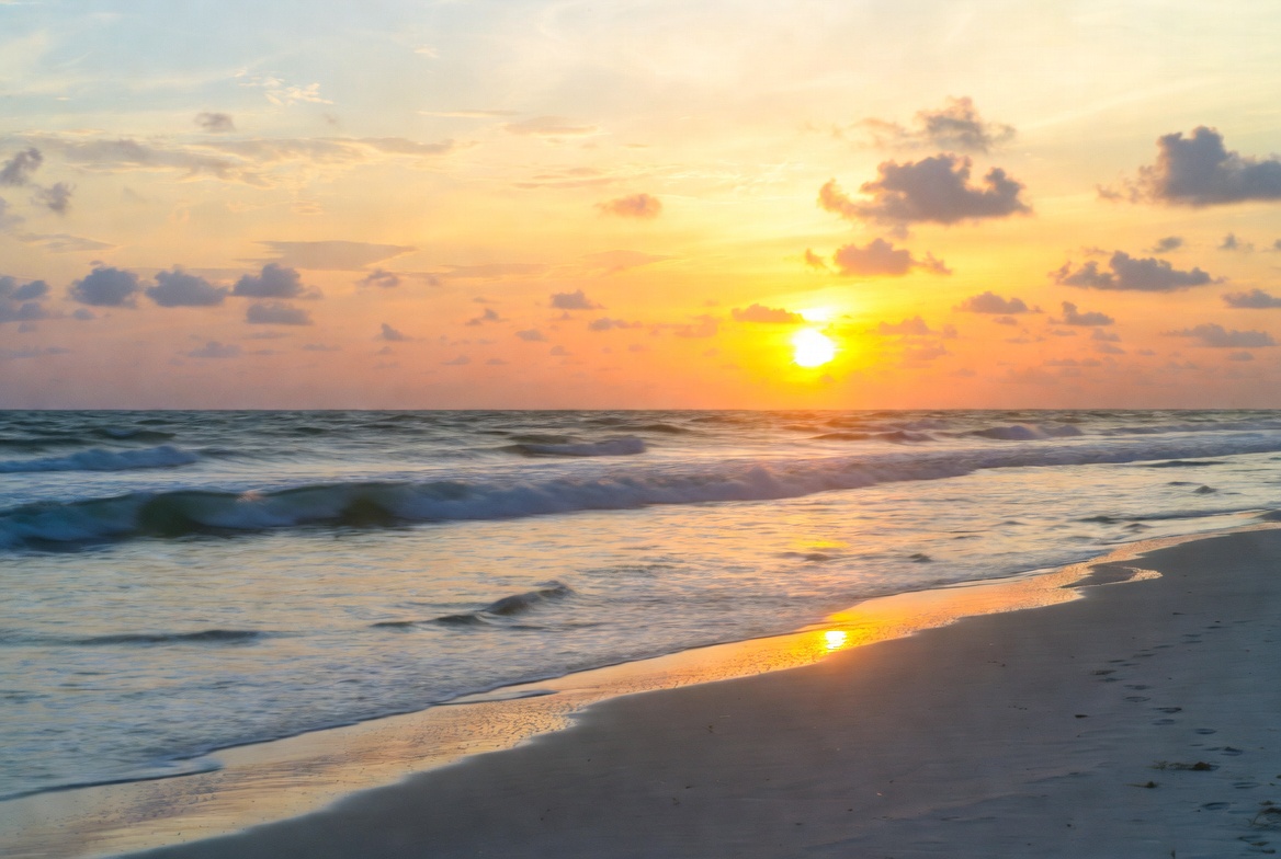 A vibrant sunset illuminates the sky with orange, pink, and blue hues over a calm ocean. Gentle waves crash onto a sandy beach with footprints visible in the wet sand. Scattered clouds enhance the colorful horizon.