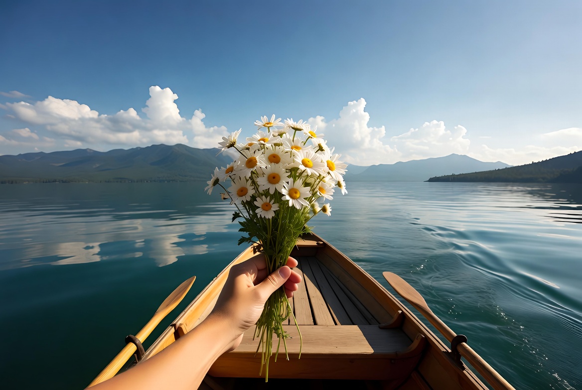 adventure, blue sky, bouquet, canoe, clouds, daisies, female, flowers, hand, lake, mountains, nature, outdoors, paddle, reflection, scenery, serene landscape, travel, turquoise water, vacation, water, white flowers, wooden boat, yellow centers, woman