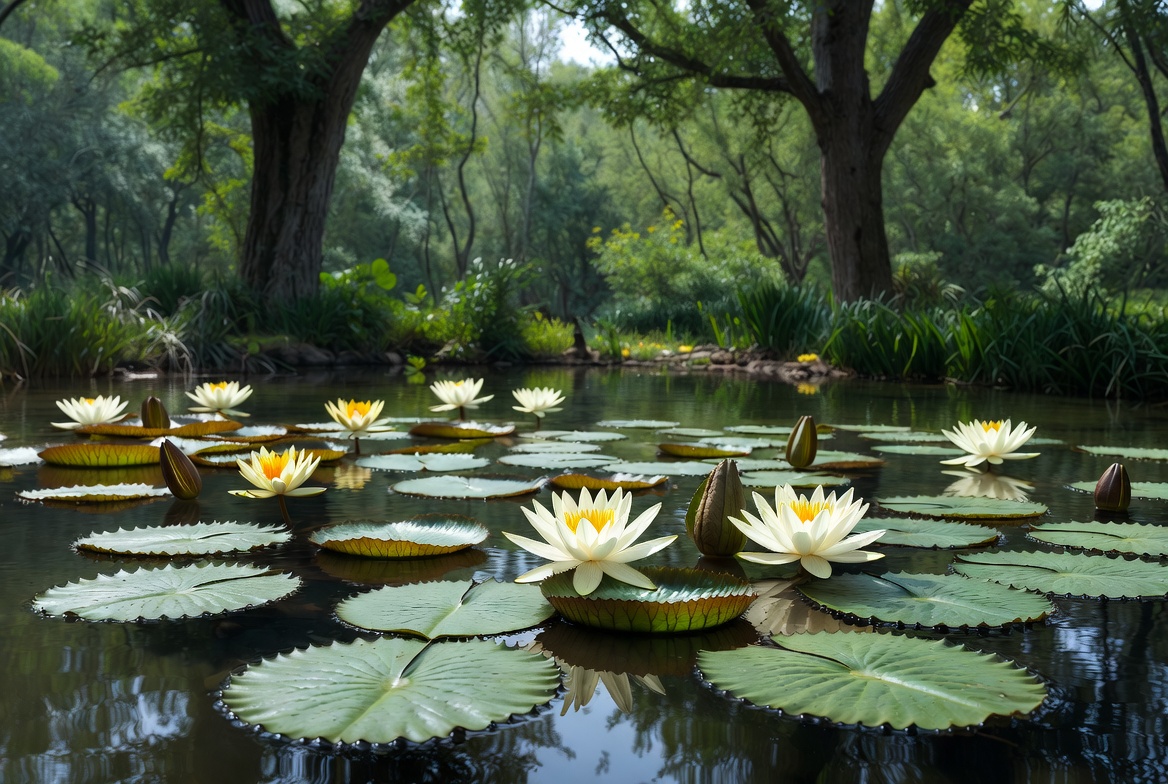 Clusters of white water lilies with large green lily pads float on a serene pond surface. The water reflects the surrounding lush green trees and reeds. Sunlight filters through the dense foliage, illuminating the vibrant flowers.