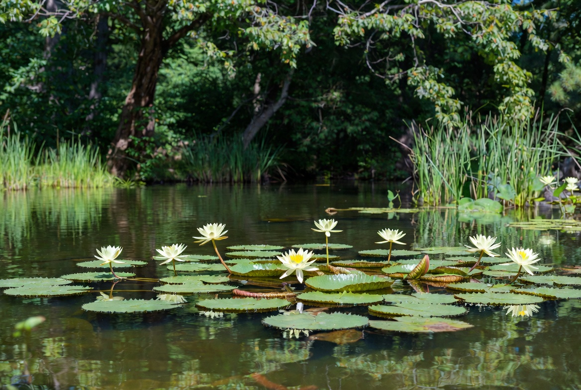 aquatic plants, bloom, flowers, green foliage, green leaves, lily pads, lush greenery, natural habitat, nature, pond, pond plants, reeds, reflection, serene pond, trees, water lilies, water plants, white flowers, white lotus, lotus flowers