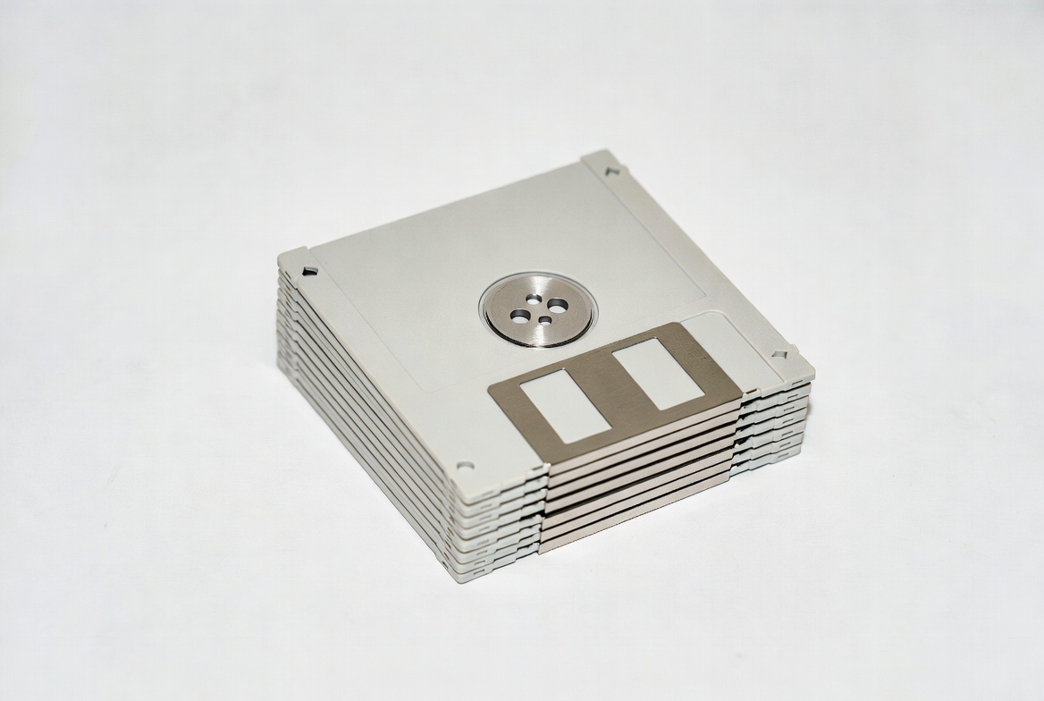 A neat stack of several silver floppy disks sits on a white background. Each disk features a black shutter and a central metal hub. The disks are aligned squarely, showcasing their classic 3.5-inch design.