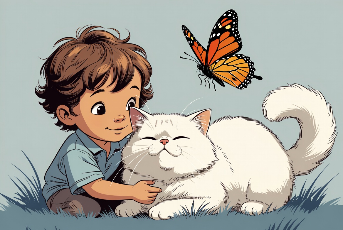 A cute cartoon boy with brown hair hugs a fluffy white Persian cat sitting on grass. A colorful orange monarch butterfly flutters nearby. The illustration features a light blue background with simple grassy details.