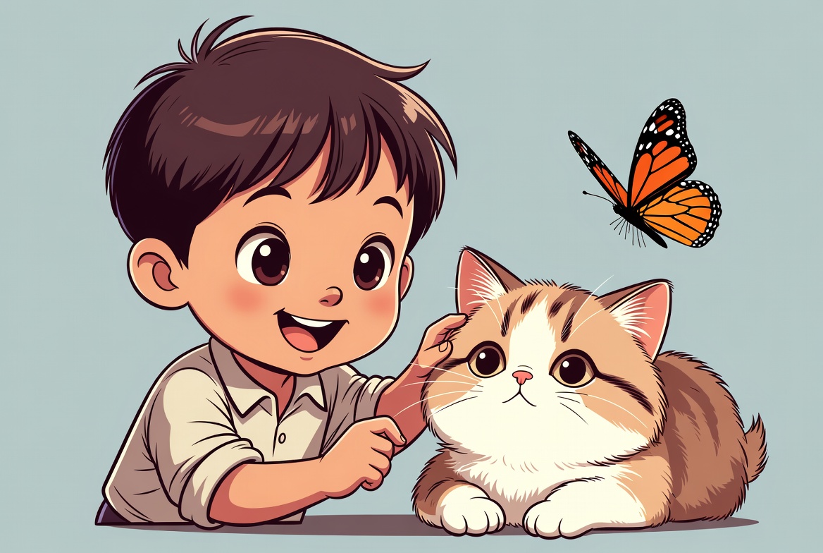 A cute Asian boy with large eyes smiles while gently petting a fluffy orange tabby kitten on a light blue background. A colorful monarch butterfly flutters nearby. The illustration features chibi-style characters in a whimsical scene.