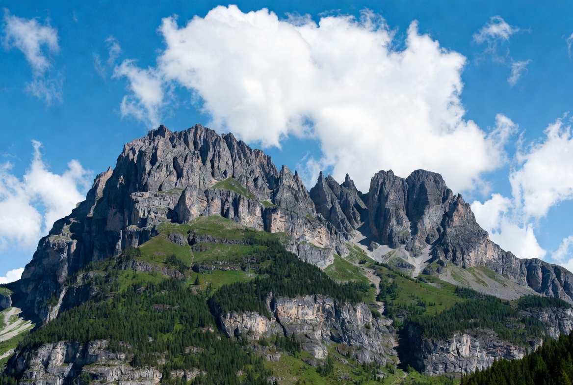 alpine landscape, blue sky, cliffs, forests, grass, green slopes, high altitude, jagged mountains, mountain range, nature, outdoors, ridges, rocky peaks, scenery, spires, summit, trees, valley, white clouds, mountains