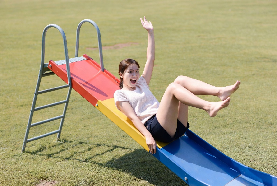 A young Asian woman with long dark hair slides down a colorful playground slide on green grass. She wears a white t-shirt and black shorts, raising one hand in excitement with bare feet visible. The slide features red, yellow, and blue sections with metal ladders and railings.