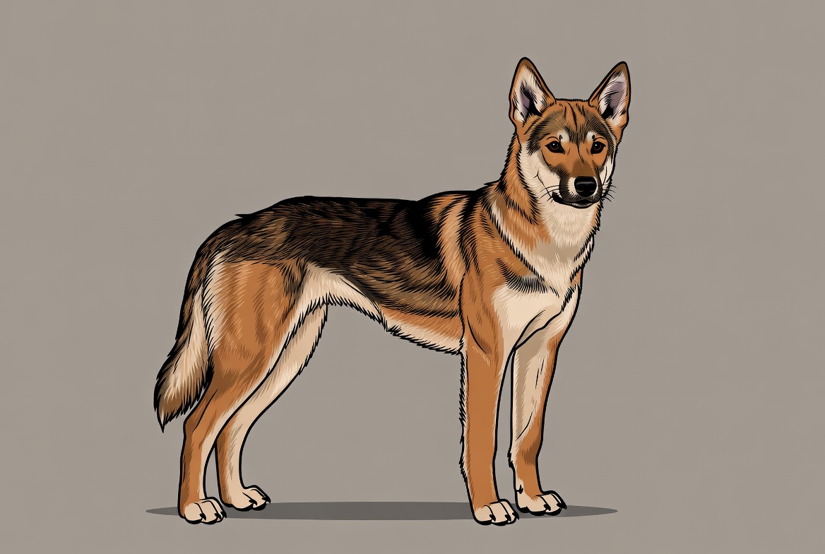 A detailed digital illustration of a German Shepherd dog standing on a gray background. The dog has a tan and black coat with pointed ears, alert eyes, and a bushy tail. It is depicted in a side profile view with subtle shading for depth.