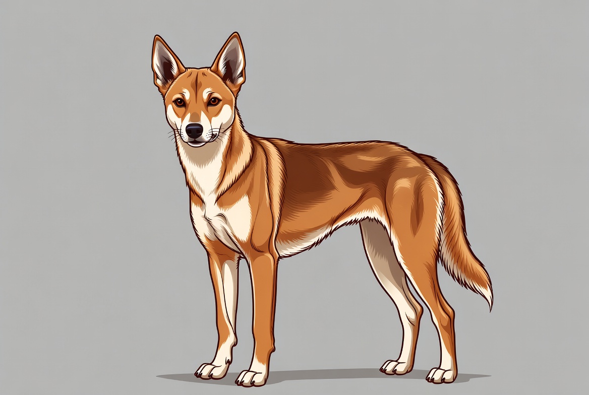 Australian dingo, alert expression, animal, bushy tail, canine, clipart, dog, illustration, isolated background, pointed ears, reddish brown fur, standing dog, vector art, white chest, wild dog, dingo