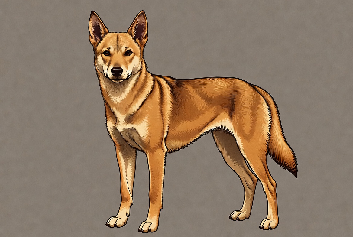 A detailed digital illustration of an Australian Cattle Dog stands on a plain gray background. The dog has reddish-brown fur, pointed ears, and alert eyes. It faces forward with a straight posture and fluffy tail.