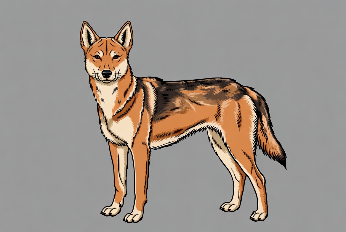 animal, breed, canine, clipart, curly tail, dog, gray background, illustration, isolated background, pet, pointed ears, profile, reddish brown fur, side view, standing dog, white markings, Basenji dog