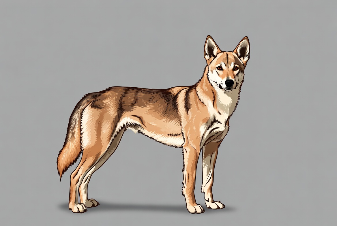 Australian dingo, alert eyes, animal, bushy tail, canine, clipart, illustration, isolated background, pointed ears, side view, standing dog, tan fur, vector art, wild dog, dingo