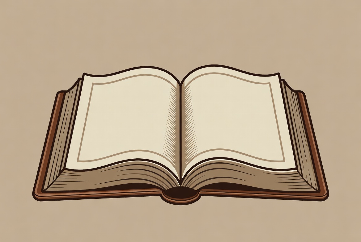 A detailed line art illustration of an open book with blank pages. The book features a brown leather cover and is centered on a beige background. The pages are white with subtle shading for depth.