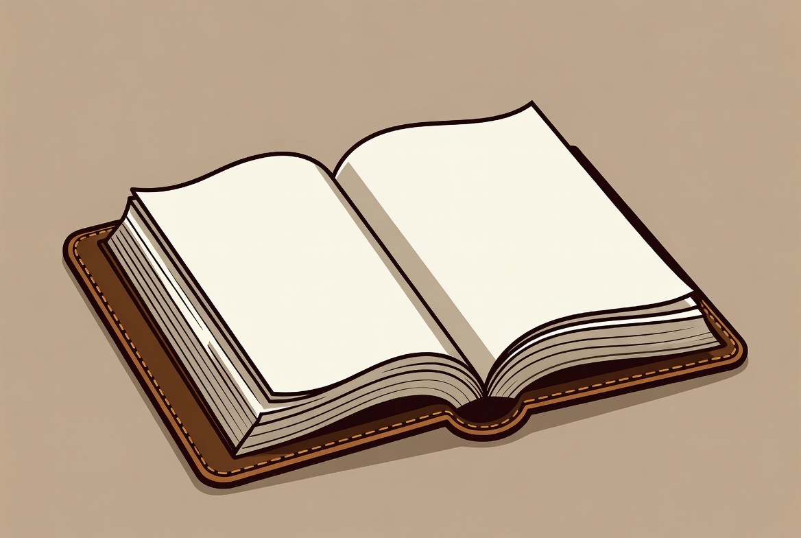 A detailed illustration of an open leather-bound book with blank white pages. The book rests on a light brown surface, showcasing its textured brown cover and curved edges. The design features clean lines and a simple, isolated background.