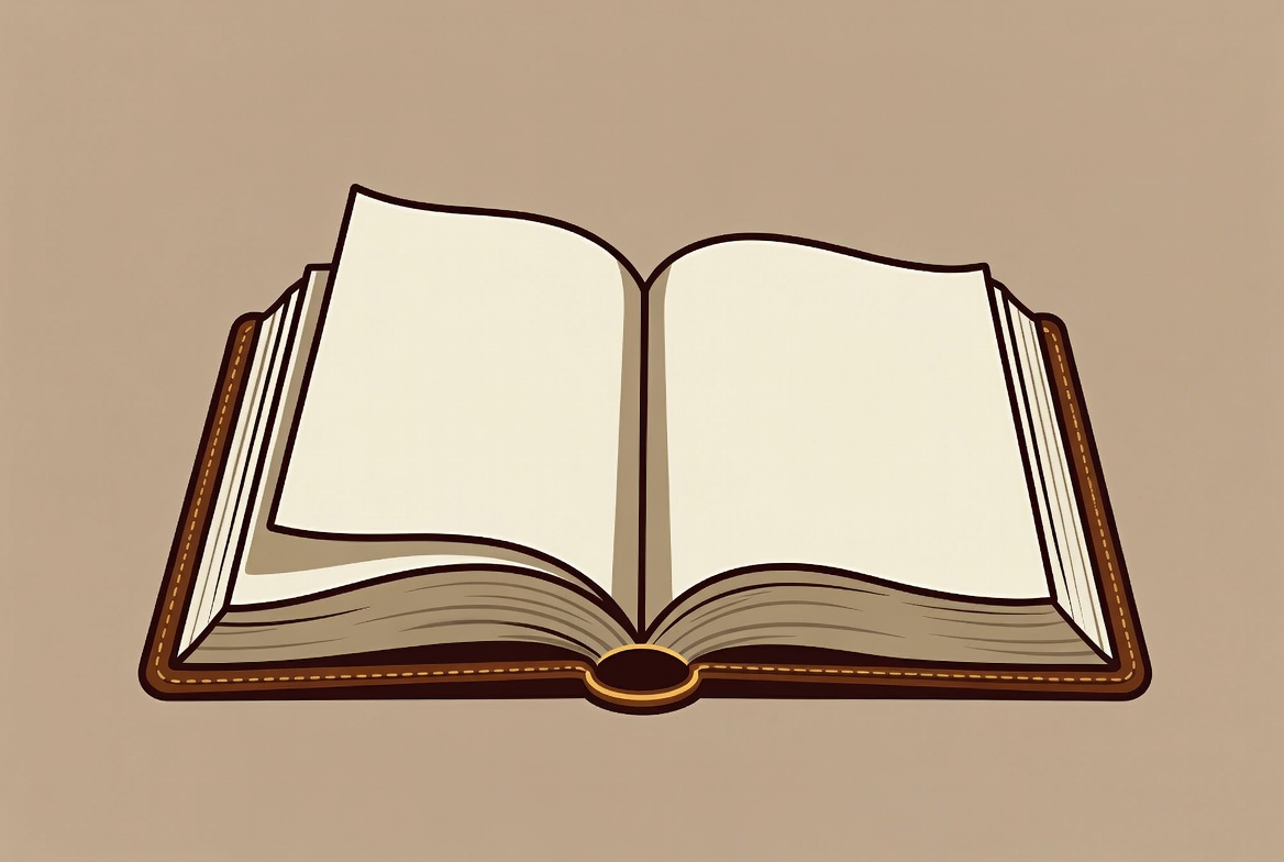 A simple clipart illustration shows an open book with blank white pages and brown leather cover. The book is centered on a beige background with subtle outlines. The pages are slightly turned, revealing empty spreads.