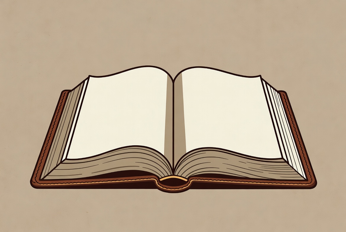 A detailed illustration of an open book with brown leather cover and blank white pages. The book is centered on a beige background with subtle shading for depth. The design features textured edges and a realistic spine.