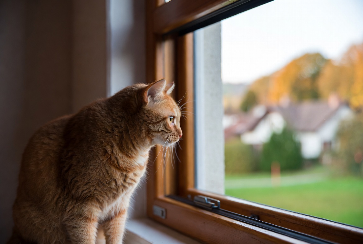 An orange tabby cat sits on a windowsill gazing out through a wooden window frame. Beyond the window, autumn trees with yellow leaves and houses in a valley are visible under a clear sky. The cat's profile shows its attentive expression and fluffy fur.