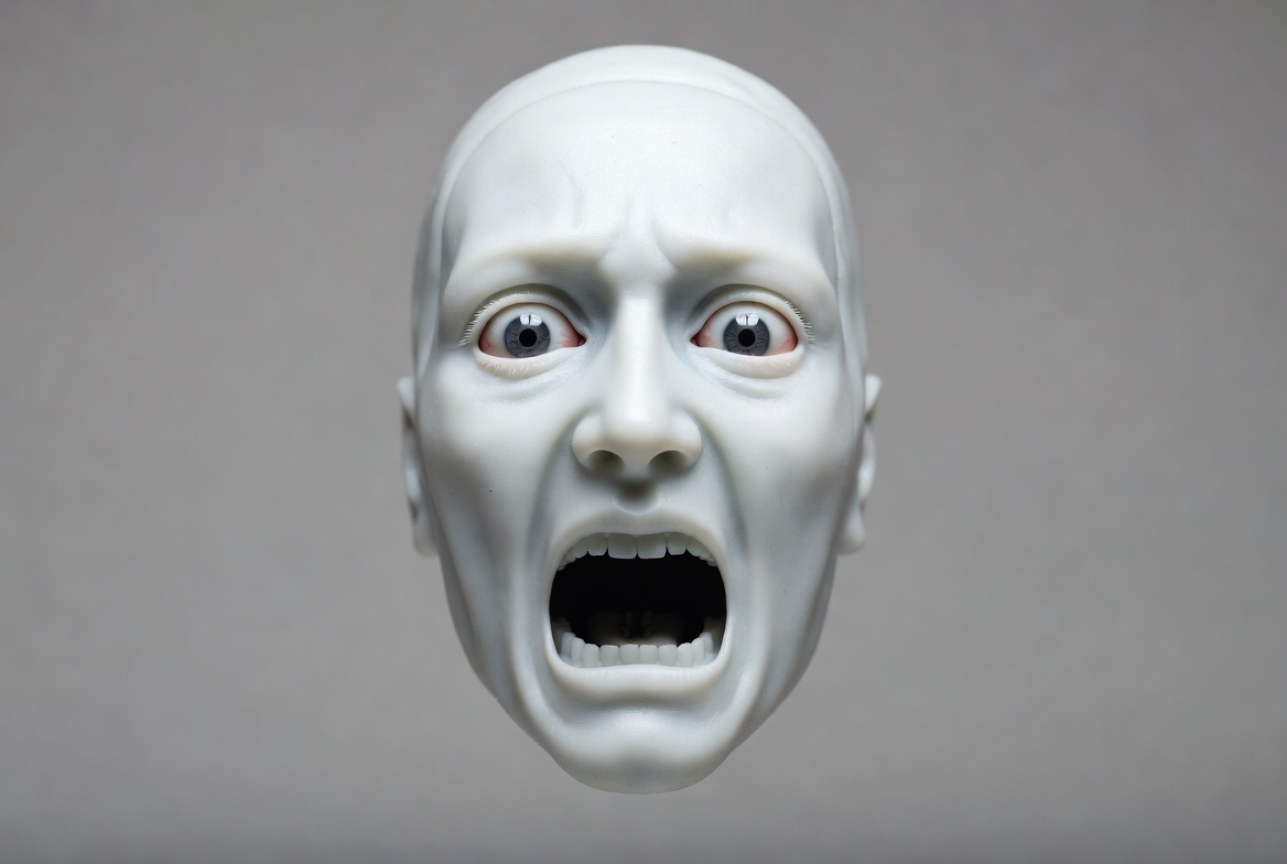 A white plastic mannequin head with wide-open eyes and a screaming mouth is centered against a plain gray background. The head features exaggerated facial expressions with tense cheeks and visible teeth. It appears isolated and detailed in smooth, glossy material.