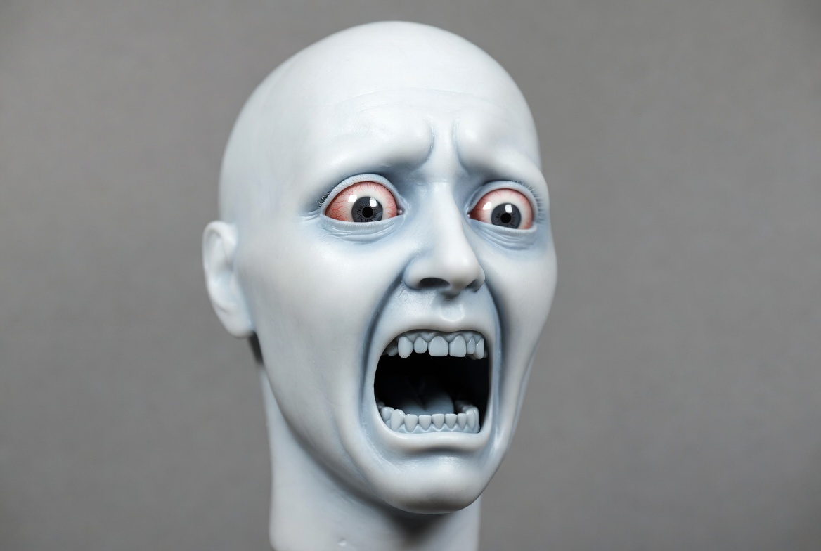 blue skin, creepy face, detailed face, furrowed brows, gray background, horror face, horror prop, isolated background, mannequin, open mouth, pale blue, prop head, realistic prop, red eyes, screaming face, screaming head, sculpture, terrified expression, wide eyes, mannequin head