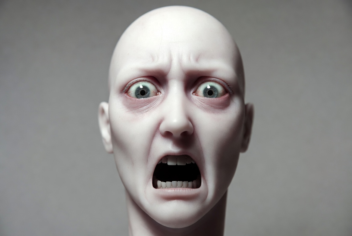 bald head, closeup portrait, doll face, eerie doll, fearful look, female, frightened female, gray background, green eyes, horror face, hyper realistic, intense expression, mannequin head, open mouth, pale skin, screaming face, sculpture head, shocked expression, surprised woman, white skin, wide eyes, woman