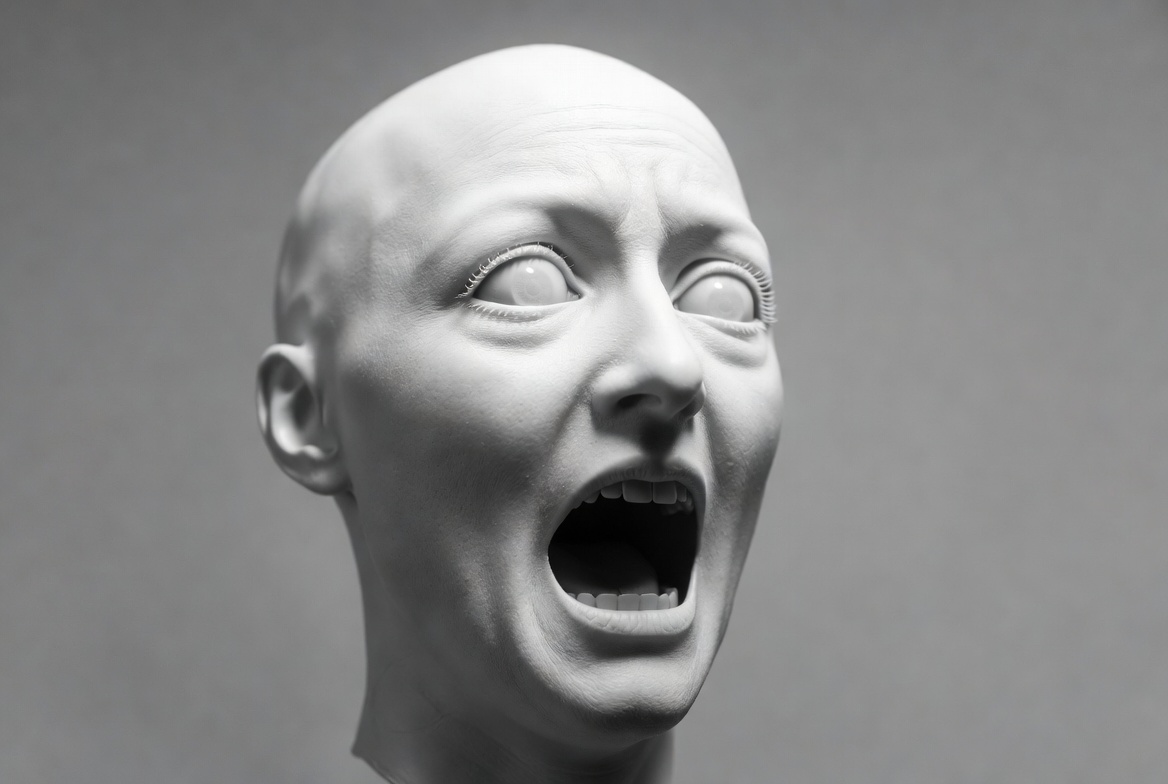 art, bald head, bust, face, female, horror expression, isolated background, marble, open mouth, screaming, statue, white, wide eyes, woman, sculpture