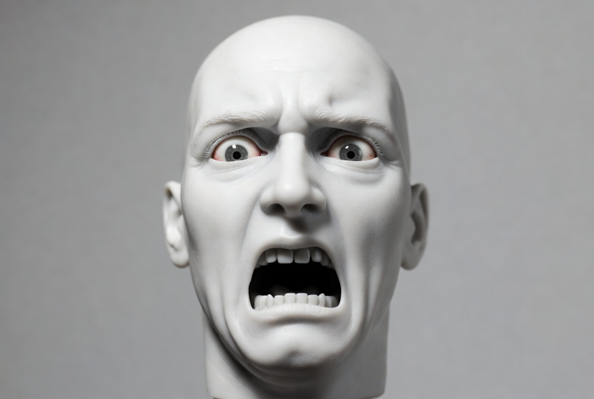 White, angry face, artistic bust, bald head, detailed sculpture, furrowed brows, gray background, head sculpture, horror expression, intense expression, male, man, open mouth, plaster bust, red eyes, screaming, shocked face, white statue, wide eyes, sculpture